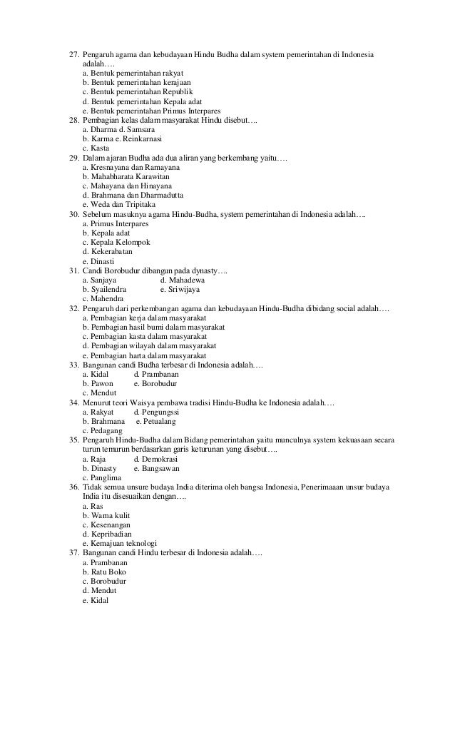 Soal Sejarah Kelas Xi Pdf Document from demo.vdocuments.mx Kali ini kami menyediakan soal tentang sejarah kerajaan kerajaan di indonesia dari kerajaan hindu buddha hingga kerajaan muslim kami rangkum di soal ini. Soal dan jawaban pilihan ganda tentang proklamasi kemerdekaan … 50 soal dan jawaban sejarah untuk kelas 10 sma/k ini bisa membawa beberapa materi yaitu sejarah dan prasejarah. Raja ke 3 kerajaan sriwijaya adalah. Itulah tadi kumpulan contoh soal debat pilihan ganda beserta jawabannya. Ranggawuni membunuh tohjaya karena …. Jika ingin request silahkan untuk mengisi form. Semperti mimpi di siang hari.
